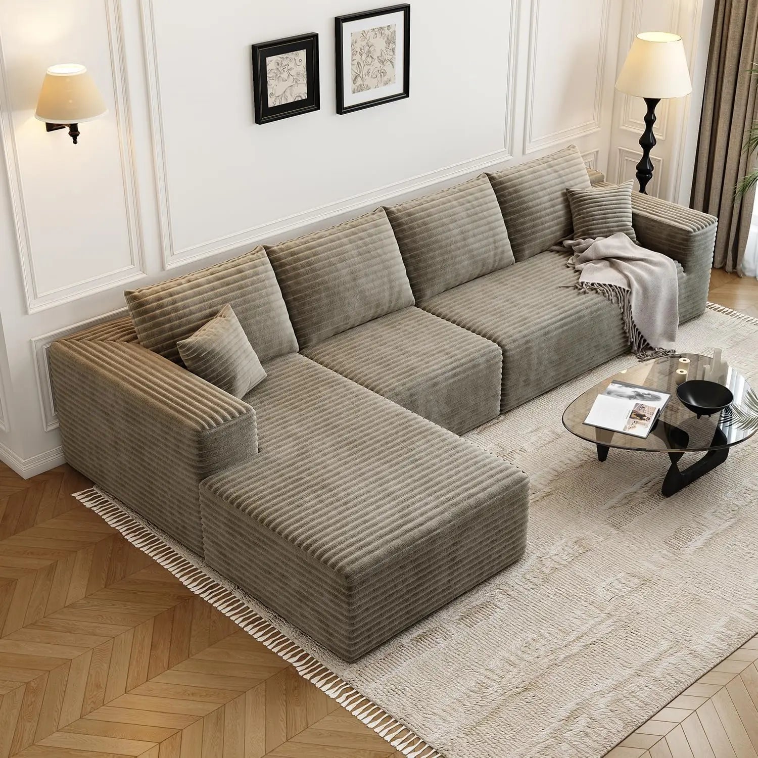 - Corduroy upholstery provides a soft, durable, and textured feel.