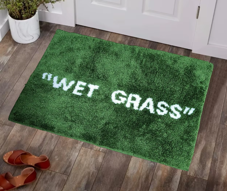This vibrant green rug with the quirky white typography “wet grass” is a refreshing nod to modern, cheeky decor. It’s the perfect way to bring a pop of personality to any space—no mowing required!